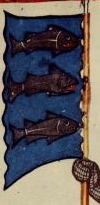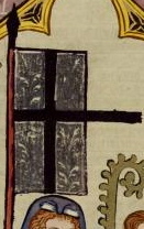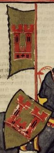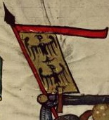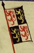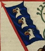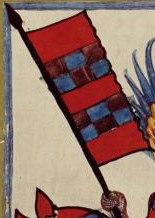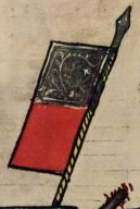 (43v) These flags protrude from finials on rooftops in a city that is being defended against attack in the scene. No one in the scene bears arms that appear to relate to them. |
